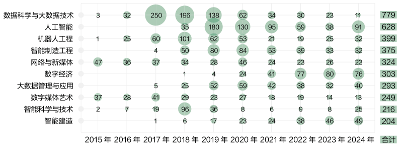 高档教育为前瞻结构,近十年新增的本科专业点高度集中于前沿科技范畴。成长款式呈现清晰梯队:数据科学取大数据手艺位居第一梯队,年均布点78个,是前期增加的绝对引擎;人工智能做为第二梯队的引领者,年均布点63个,近年来成长更为迅猛。机械人工程、智能制制工程、收集取新等一批沉点专业亦呈现规模化增设态势,配合响应着时代对立异人才的火急需求。